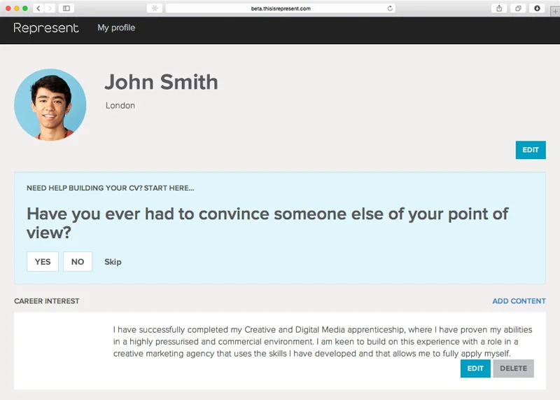 With support from White October, a digital agency, I co-founded and led a startup venture called Represent, a digital platform connecting school and college leavers to work and training opportunities based on their skills and talents. Online professional profiles helped young people discover their strengths and showcase life experiences as evidence of their talents to employers.