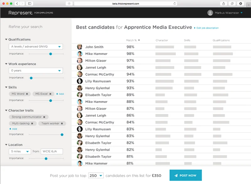 Represent would offer employers a self-service recruitment platform for entry-level and trainee positions, helping them target opportunities to the best matching candidates and improve their shortlisting process. Recruiters could compare candidates at a glance and drill down on relevant information and evidence more easily.